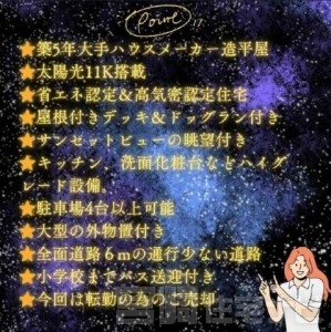 築5年平屋で高性能。大手造りで太陽光11K高気密C値0.4海抜約60m。太陽光11k搭載。お昼は自家発電で電気代節約。築10年後に自己所有になるリース設置。 |